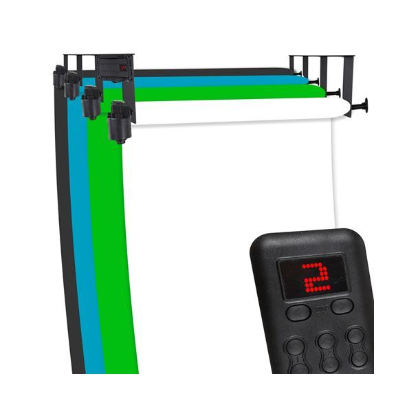 Rol met 1 druk op de knop je achtergrondrollen op en neer. De B-4WE is een elektrisch systeem van StudioKing en kan maximaal 4 rollen dragen. Met dit systeem kies je eenvoudig welke kleur je als achtergrond wil gebruiken. De breedte van het achtergrondsysteem bepaal je zelf, op basis van je papierrol. Dit achtergrondsysteem werkt dus óók met papierrollen van 1,35 en 2,18 breedte. Met de meegeleverde afstandsbediening laat je de rollen naar boven of beneden rollen.