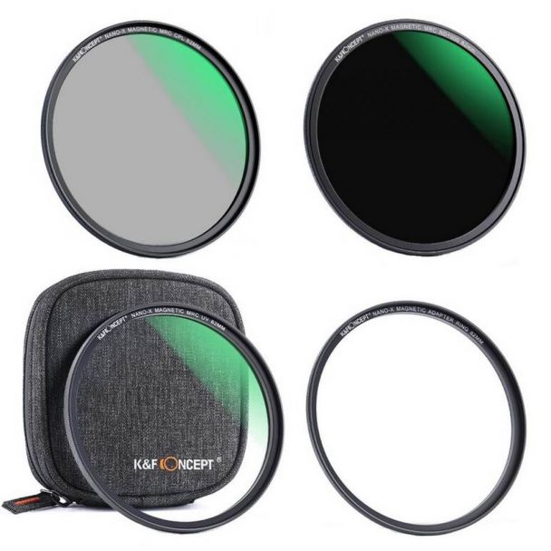 Complete set bestaand uit een UV filter, Circulair polarisatiefilter en een ND1000 filter. Het geheel wordt geleverd in een solide opbergpouch. De set is magnetisch en wordt geleverd inclusief magnetische filterring. Alle drie de filters zijn voorzien van een water en kras bestendige nano anti-reflectie coating.