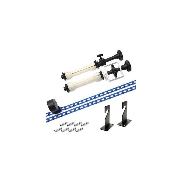 Een zeer voordelige oplossing voor het ophangen van één rol achtergrondpapier of vinyl aan de muur of aan het plafond. De rolhouders worden in de kartonnen koker van de rol gestoken en dan uitgedraaid tot de rol er vast op zit. Met de ketting kan de rol tot de gewenste lengte afgerold worden. De meegeleverde metalen houders, waarin de rolhouders worden gehangen, kunt u aan de muur of aan het plafond bevestigen. Het systeem is niet zelfremmend, daarom adviseren wij een of meerdere rolklemmen mee te bestellen. De kleuren van de kettingen kunnen afwijken zoals getoond op de foto's. Bij gebruik van zware vinyl of papier achtergronden adviseren wij om een metalen ketting (zie relevante producten) te gebruiken.