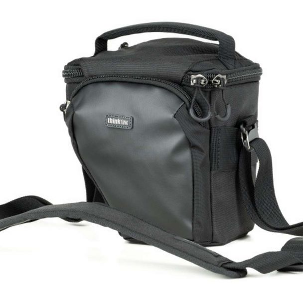 Unieke holster speciaal ontwikkeld voor een compacte spiegelloze body, zoals een Canon R50 of R10, Nikon Z5, Fuji X-T30 of Sony A6000-serie body met een korte lens bevestigd.
