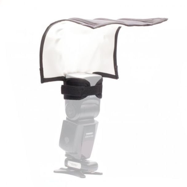 Met deze vouwbare bounce reflector transformeer je het harde licht van je reportageflitser direct naar zacht, professioneel licht. Waar een standaard omnibounce het licht alle kanten op verstrooit (en dus veel kracht verliest), stuur je met deze reflector het licht precies waar jij het wilt hebben. Dankzij het slimme ontwerp met 3 interne buigbare spiralen behoudt de reflector elke vorm die je hem geeft.
